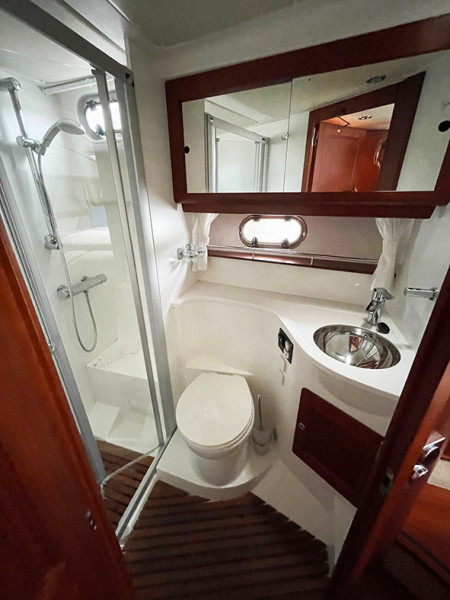Ankerkette, Badeleiter, Badeplattform, Bugstrahlruder, Cockpittisch, Frontscheibenlüfter, Gangway, Heckdusche warm/kalt, Heckstrahlruder, Hecktür zur Badeplattform, Heizung, Radio, SAT-Antenne, Trimmklappen el./hydr., Warmwasseranlage