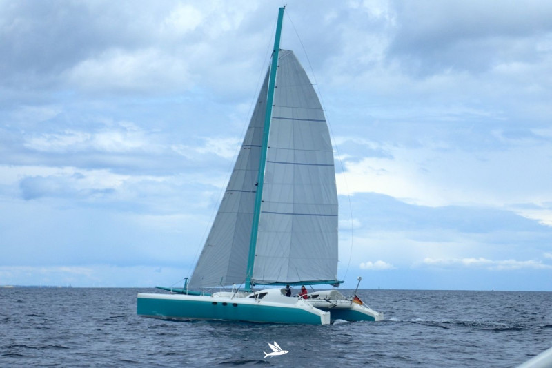 This exceptional Wavedancer One-Off performance catamaran was designed as a long-distance cruiser for fast and safe sea passages in autonomous operation, with excellent comfort below deck. Wavedancer is a sporty and fast catamaran that is also very easy to handle. The helm is neutral. This catamaran was built in Hamburg using a GRP-EPOXY-Divinycell sandwich construction, reinforced with carbon – a modern, stiff, and lightweight build with a rotating carbon mast, profiled daggerboards, boom, and bowsprit. The rotating wing mast optimizes wind flow to the mainsail. The trampolines between the hulls allow you to hover about 1.40 meters above the sea, remaining almost dry even in rough conditions. The rudder blades, as the daggerboards, are retractable, allowing for the discovery of shallow waters and anchoring in sheltered bays close to the shore. Wavedancer has just been modified with negative bows for even more buoyancy and performance. A recent refit has been completed. The catamaran is now ready for viewing and handover on the river Elbe in Hamburg-Wedel.