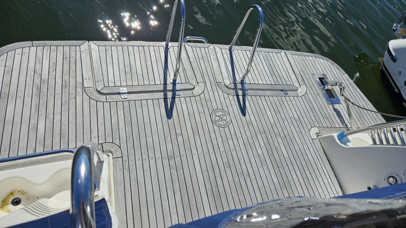 Eignerkabine, Gästekajüte, Geräteträger klappbar, Innenfahrstand, Teak auf Badeplattform, Teak auf Gangborden, Teak auf Vorschiff, Teak im Cockpit, Teak in Kabine