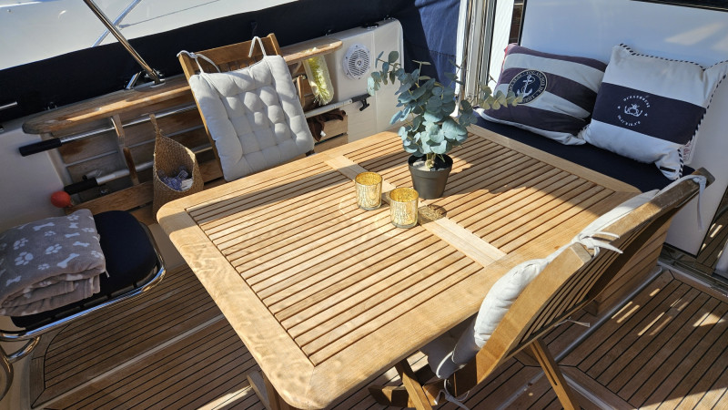 Abgeschlossener Salon mit Schiebetür, großes Achterdeck,