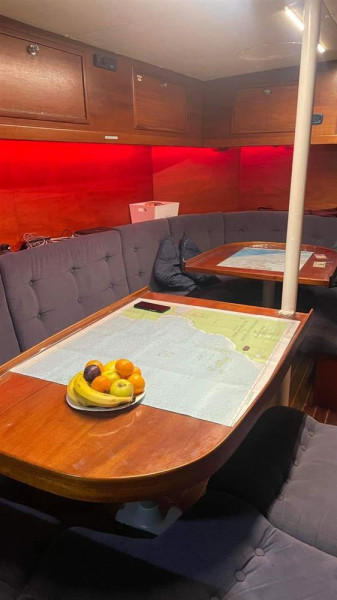 On The Port side is the main seating area. The Settee is U shaped to allow comfortable use on either tack, and the table is split to allow easy access.