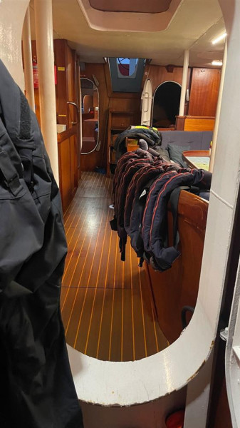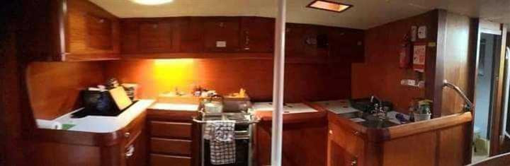 On the Starboard side is a large Galley fitted with a crash bar to provide a secure working environment in heavy weather. The cooker is positioned fwd to prevent the crew being thrown against it and is fitted with high fiddles. Extra large fridge with new unit fited 2021 Extra large cool box, can be easy turned in extra fridge.