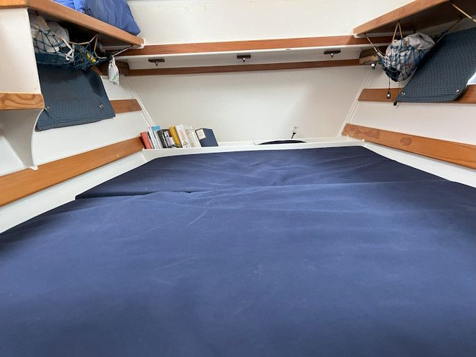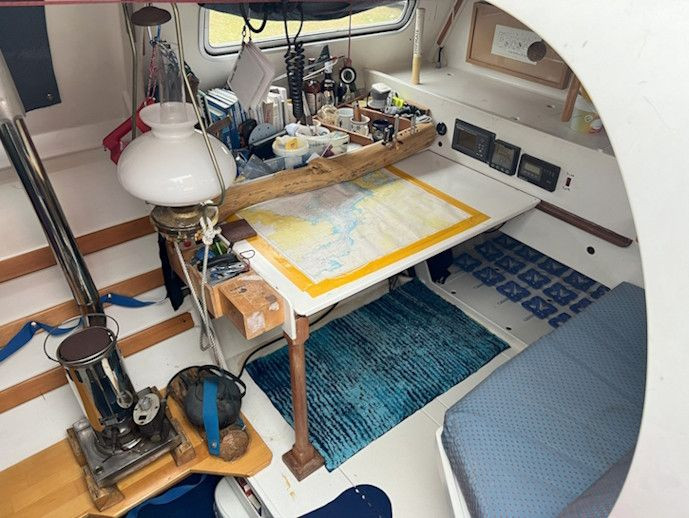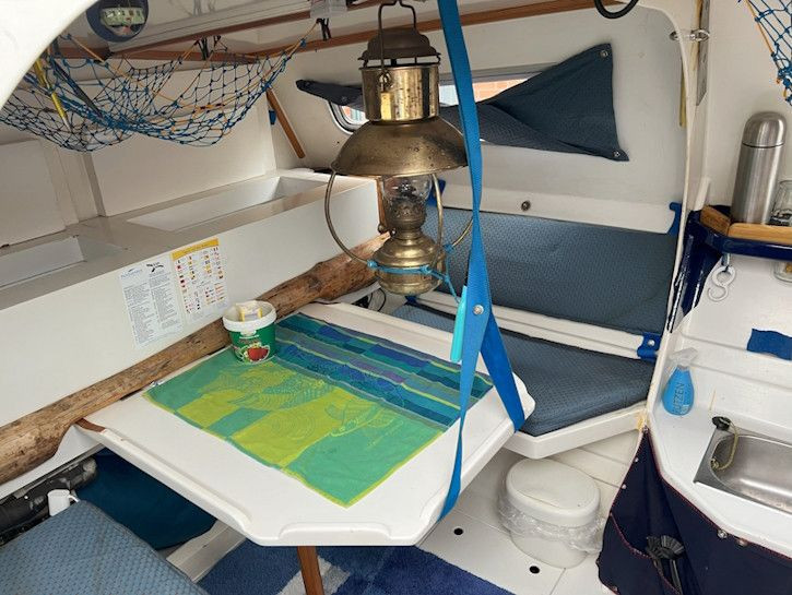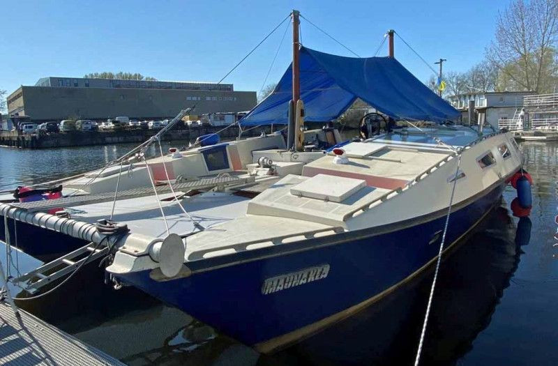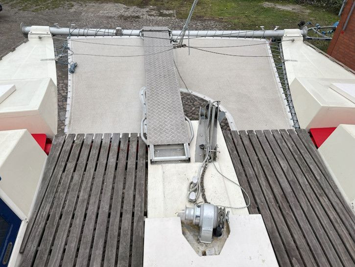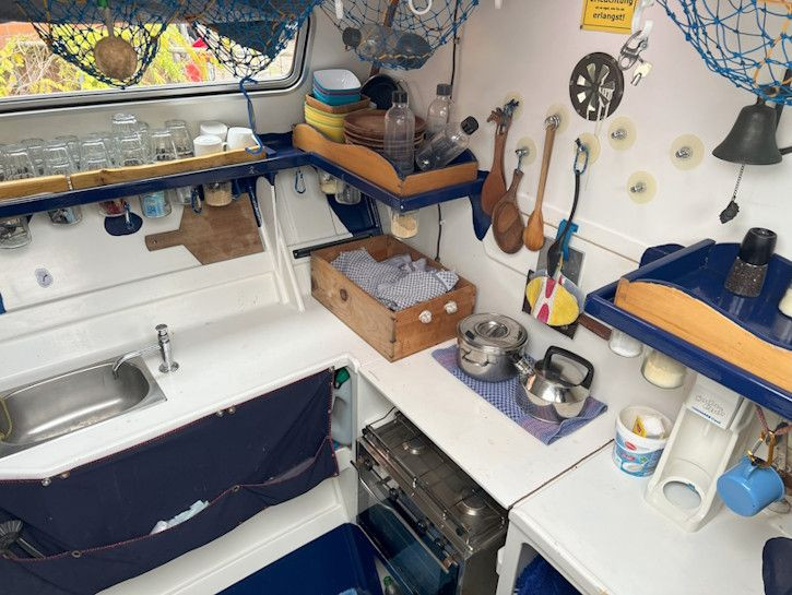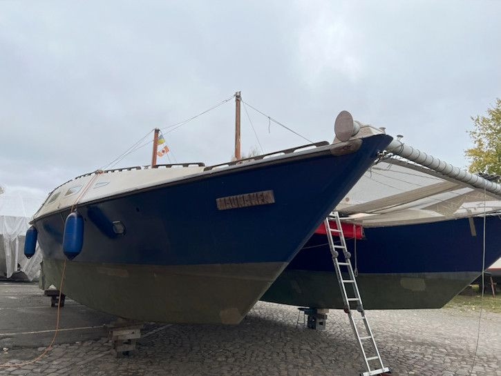 A rare example of Original James Wharram plan N°213 professionally build by Phil Young and well modified NARAI Mk. IV design. Tiki decks-layout gives 1,50m more width as standard. Very well build in Marine Mahogany ply with GRP/Epoxy reinforcement. In 2002 the German owner couple bought the cat from the builder and up-graded her for a comfortable life at sea, before they sailed this Wharram catamaran during summer seasons on the North- and Baltic Sea. Since 2010 she was always hauled out for the wintertime ashore in Hamburg. The cat is fully-equipped for safe sailing, offers full standing headroom (2,10m) in the hulls with the raised and widened deck-houses. This modernized Wharram-design offers exceptional space below and on deck. The mizzen-masts has been taken away, because the sloop rig performs very well and is easy to handle. Full set of sails in good working order and lots of equipment comes along. A most renowned, safe and sound cruising catamaran immediately available for your viewing and to be handed over with lots of spares and equipment and berth, if requested.