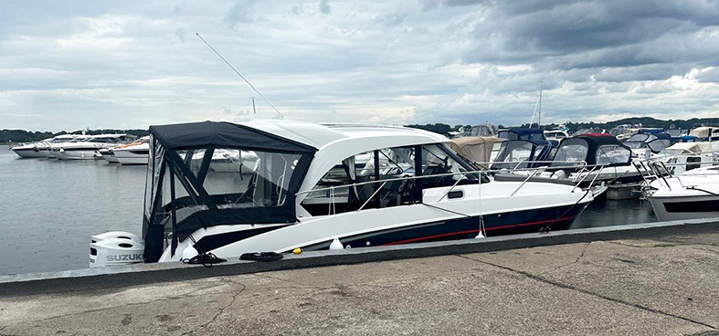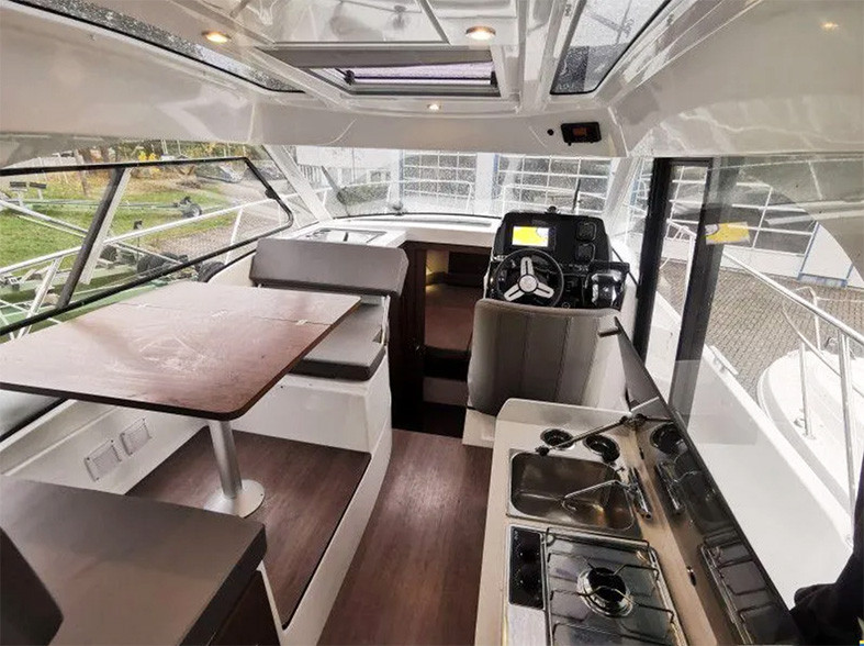 Unterdeckstisch, BB-seitiges Schiebefenster, 2. elektrischer Scheibenwischer mit Waschanlage, Fußstutze Fahrer, 2 Angelrutenhalter, Becherhalter, Cockpittisch aus Polyester, Vorhänge innen, Angebaute Badeplattformen, Elektrisches Ankerspill, Fußboden Eiche braun im Ruderhaus
