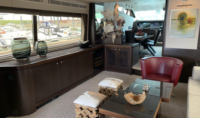Dazu kommen umfangreiche Polster- und Persenningpakete wie Bugpolster, Cockpitpolster, Polster Achterdeck, Sonnenpolster auf der Flybridge, Cockpitpersenning und Verdunkelungsvorhänge.