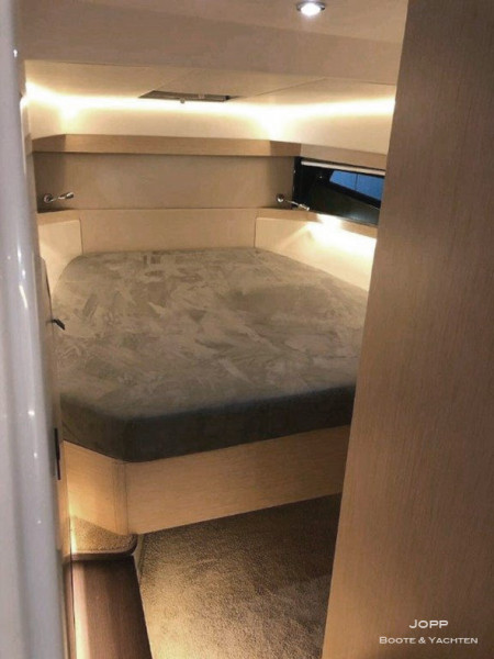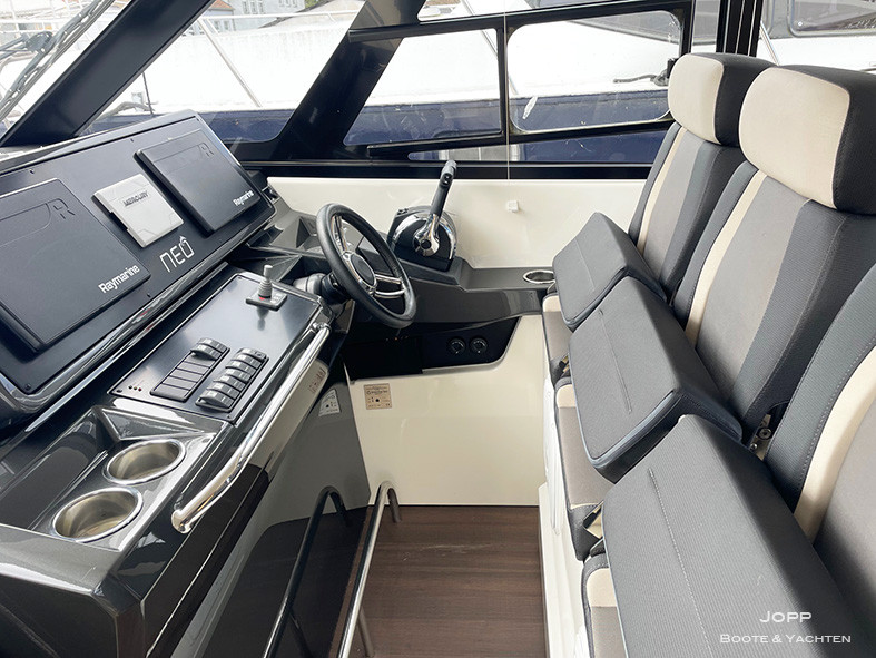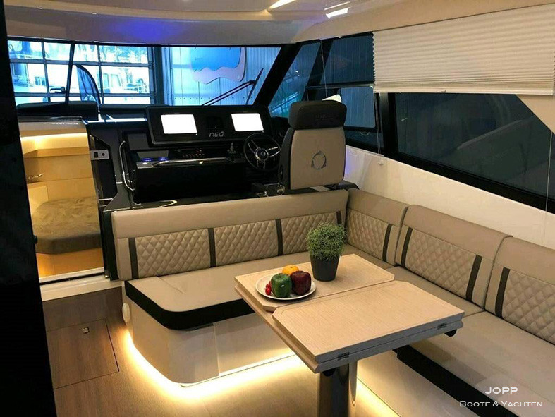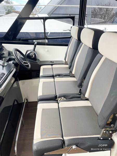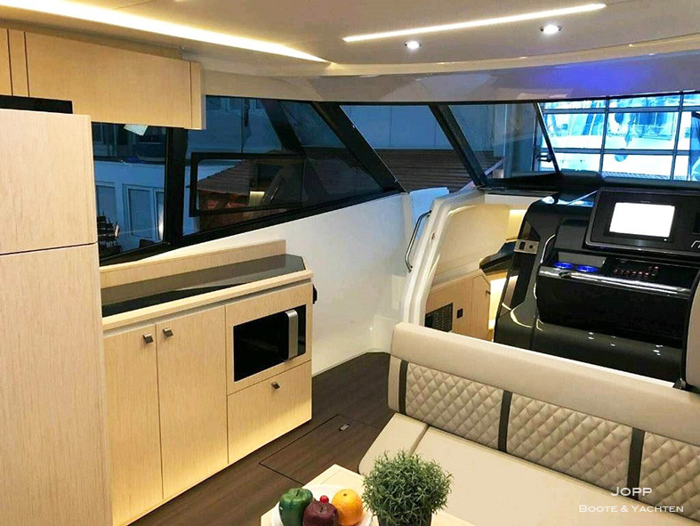 Bugkabine, Einzelsitze vorn, Innenfahrstand, Salon, Teak auf Badeplattform, Teak im Cockpit