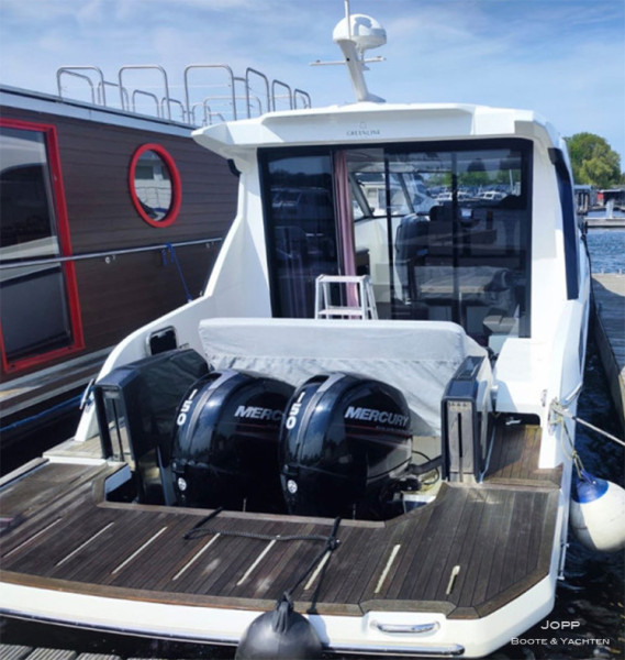 Höchstgeschwindigkeit mit den 2x 150 PS Außenbordmotoren ca. 35 Knoten (ca. 65 km/h), kommt sehr gut aus dem Wasser