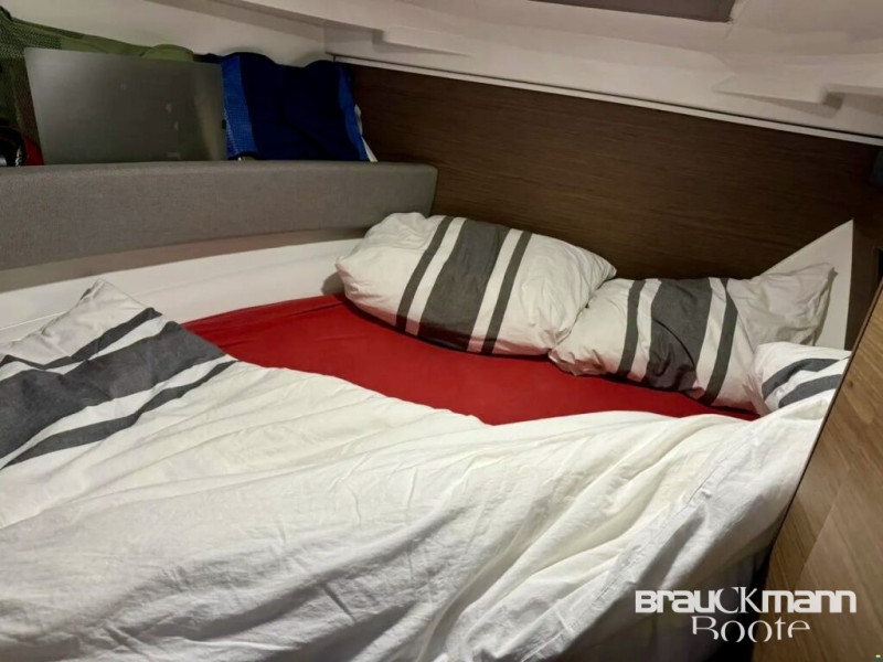 • Schlafbereich im Vorschiff mit Polstern, Ablagen, Beleuchtung, Lautsprechern und Decksluke
