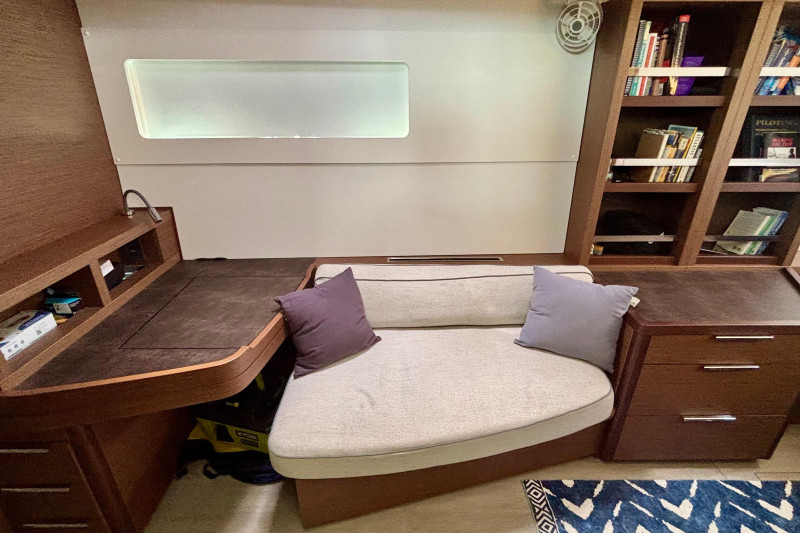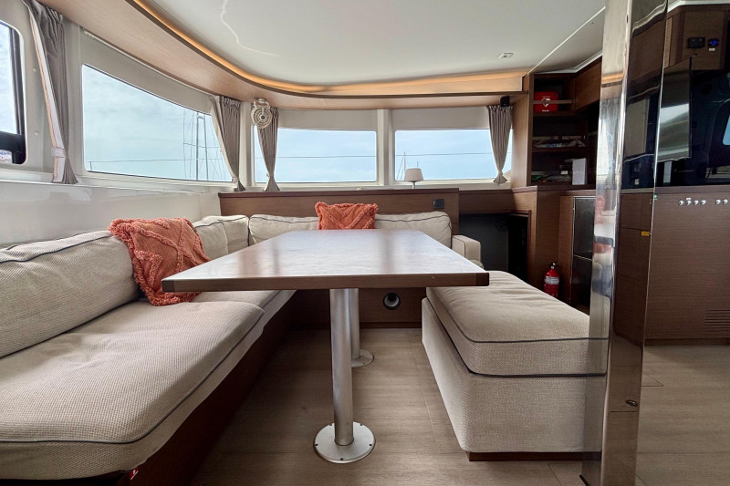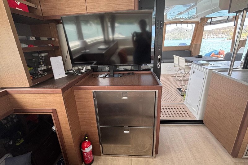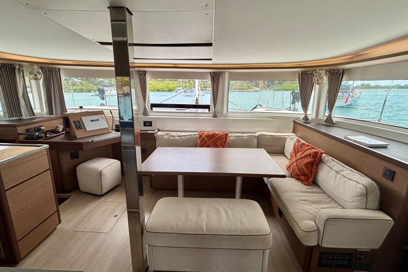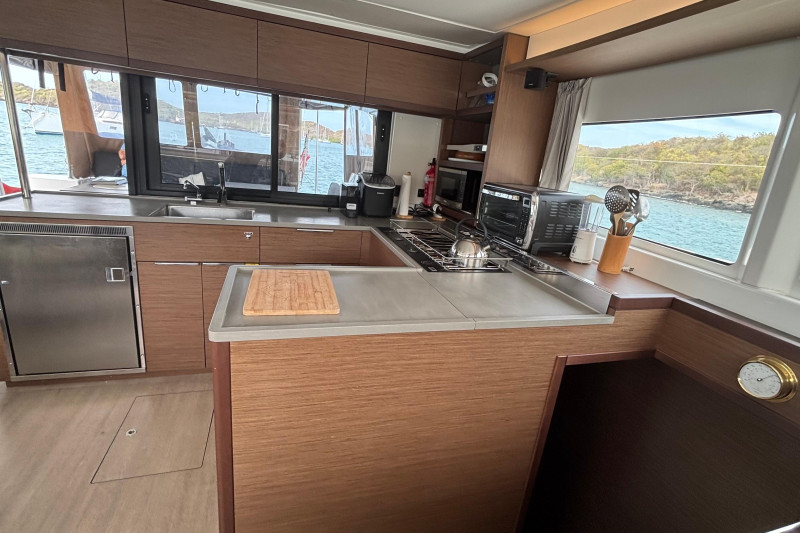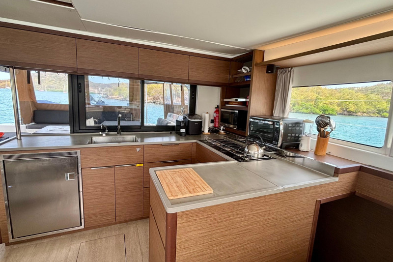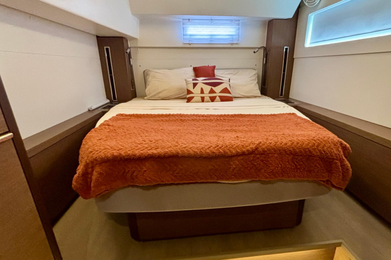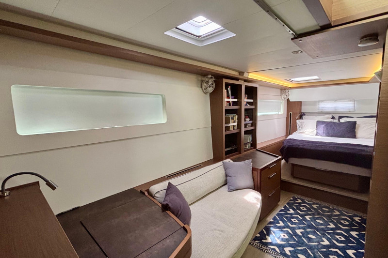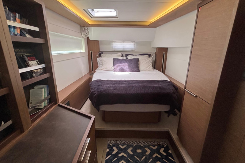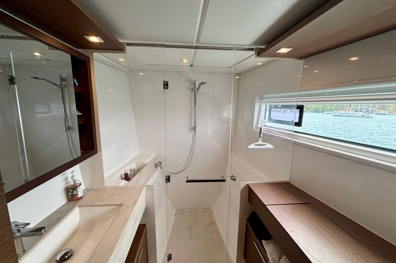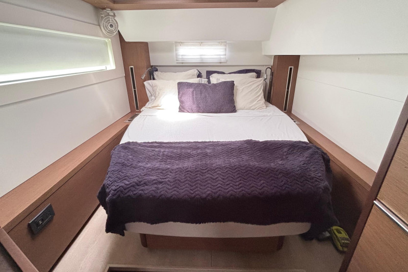 Saloon: The main saloon is entered via sliding glass doors from the aft cockpit. Large wraparound windows provide exceptional natural light and 360-degree views. To starboard is a spacious L -shaped settee dining table and bench. An angled forward-facing navigation table with chart plotter and control station. To stb aft is the electrical switch board with full electrical monitoring above the stainless steel fridge freezer.Galley: The L shaped galley is positioned port side aft of the saloon. Features include: Generous counter space, stainless steel sink, front-opening refrigerator, 4 burner stove oven and grill, modern appliances with plenty of storage and drawer space.Owner’s Hull: The starboard hull is dedicated entirely to the owner’s suite, creating a private space that rivals much larger yachts. This full-beam cabin features a generous island berth, ample natural light from large hull windows, and excellent ventilation. A spacious dressing area with abundant storage, hanging lockers, and cabinetry leads to a large en-suite bathroom with a separate shower and modern fixtures. Separate electric head and washbasin. Guest Hull: The port hull accommodates two well-appointed guest cabins, each with comfortable double berths, ample storage, and private en-suite bathrooms. Both cabins benefit from large windows and overhead hatches, providing a bright and airy atmosphere for guests.