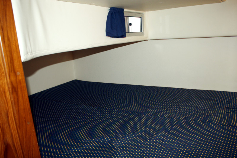 Bugkabine: großes Doppelbett, Stauraum, Decksluke mit Verdunklung