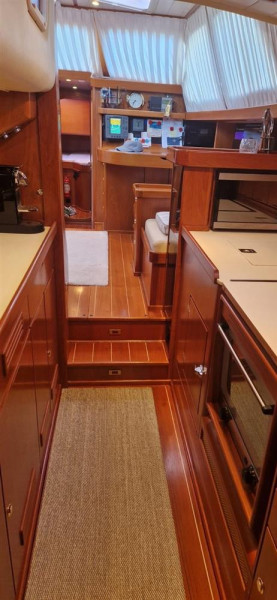 Spacious saloon with seating around table to port, large galley to starboard with passageway to aft cabin. Navigation station to starboard.