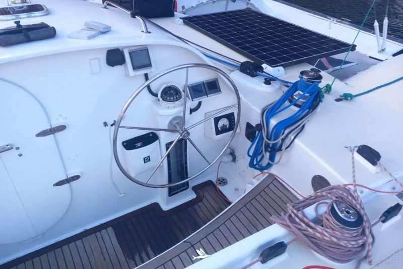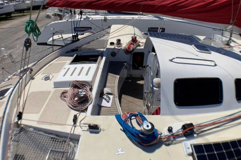 Discover a 2002 fast cruising trimaran designed by Philippe Rivière, offering performance, comfort, and safety. With sleek lines and Newick-inspired heritage, she provides both the thrill of sailing and the reliability needed for long-distance voyages. The cockpit and deck are crafted with teak for a classic, durable finish, ergonomically laid out for comfortable passages. Below deck, the saloon is spacious and bright, with seating and integrated sleeping nests, generous storage, making extended cruising effortless. The aft cabin offers a large double berth with elegant wood trim, while deck hatches provide natural light and ventilation. Safety is a priority: she comes with a comprehensive safety package renewed in 2024, providing peace of mind for offshore passages. Equipped for autonomy, she features efficient energy systems and smart storage, allowing self-sufficient long-distance cruising. She delivers a rare combination of robust build, high-quality finishes, and practical comfort, making her a sound and elegant ready-to-sail performance-trimaran. For further information, please contact: info@cat-sale.de