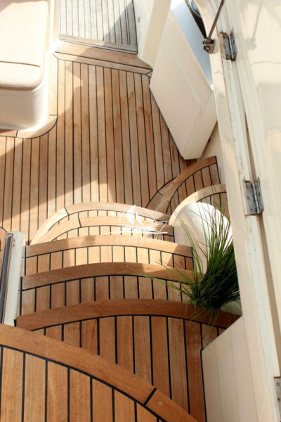 Badeleiter, Badeplattform, Cockpittisch, Druckwasseranlage, TV, Radio, Sonnenpolster auf Vorschiff, Tandemtrailer, Trimmklappen el./hydr., TV Antenne, Warmwasseranlage, Lautsprecher