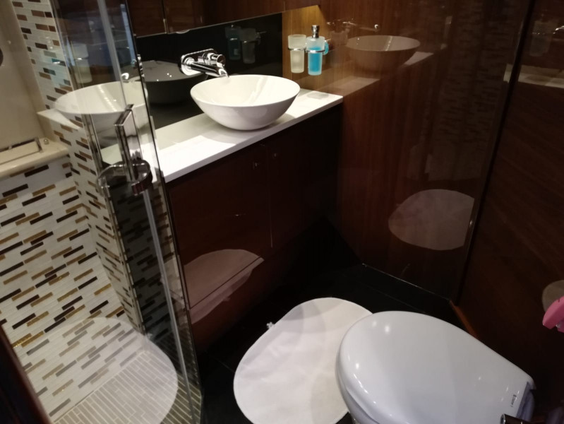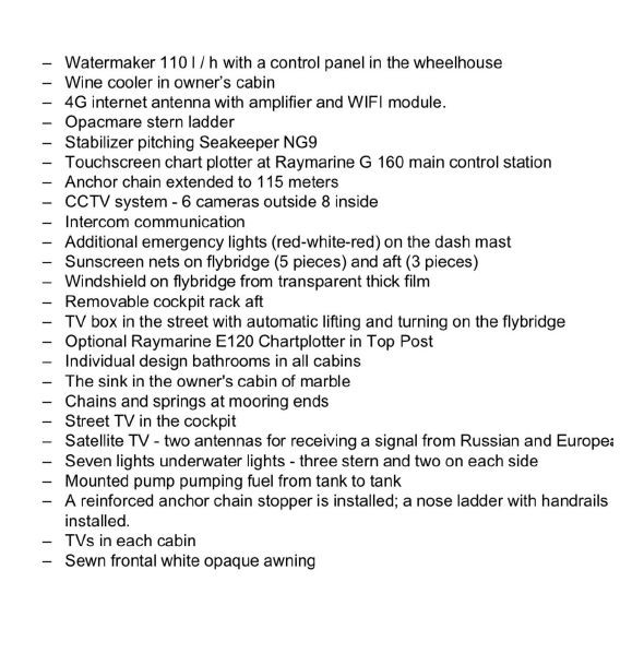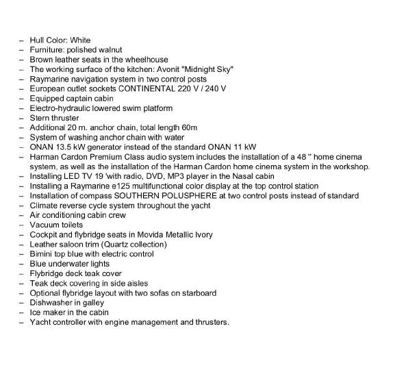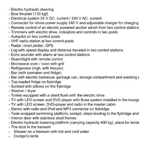 2. Kühlschrank, Badeleiter, Badeplattform, Bugstrahlruder, CD-Player, Cockpitdusche, Cockpitpolster, Cockpitspüle, Cockpittisch, Deckdusche, Deckdusche warm/kalt, Druckwasseranlage, DVD-Player, TV, Fender, Festmacher, Gangway elektrisch, Heckstrahlruder, Heizung, Icemaker, Klimaanlage, Kühlschrank an Deck, Lautsprecher, Polster, Radio, SAT-Antenne, Trimmklappen el./hydr., Unterwasseranstrich, Warmwasseranlage, Waschmaschine/Trockner, weitere Extras