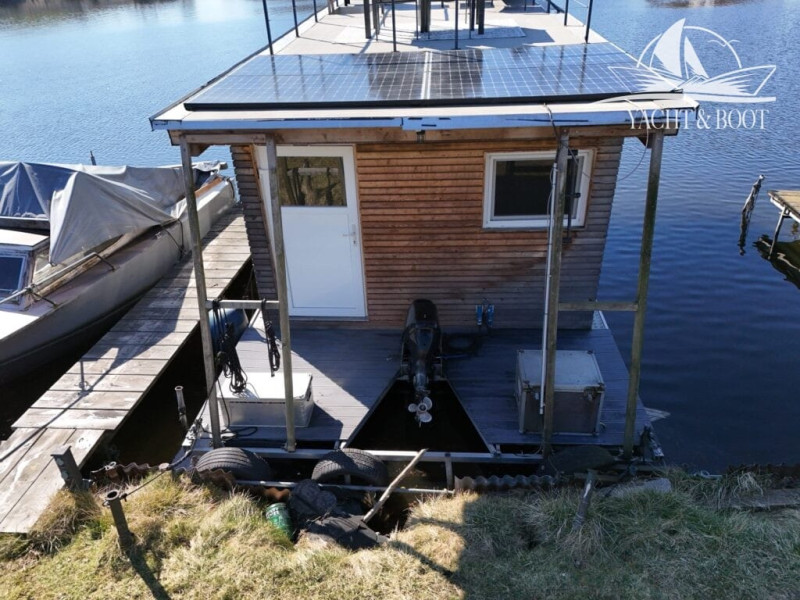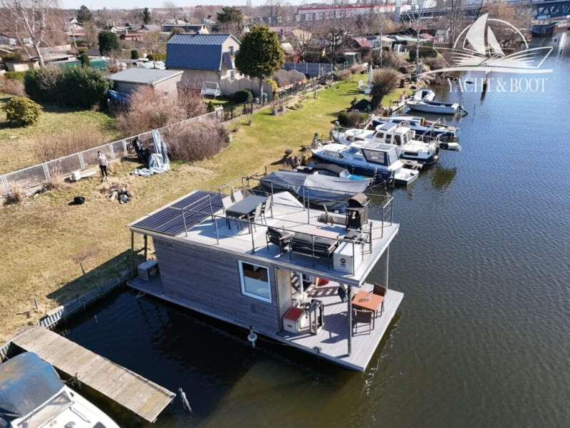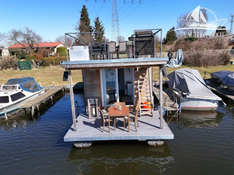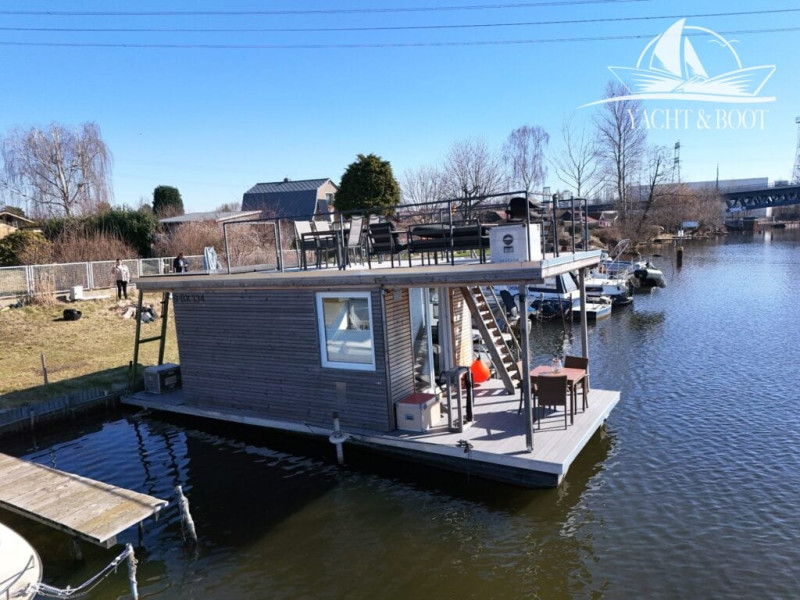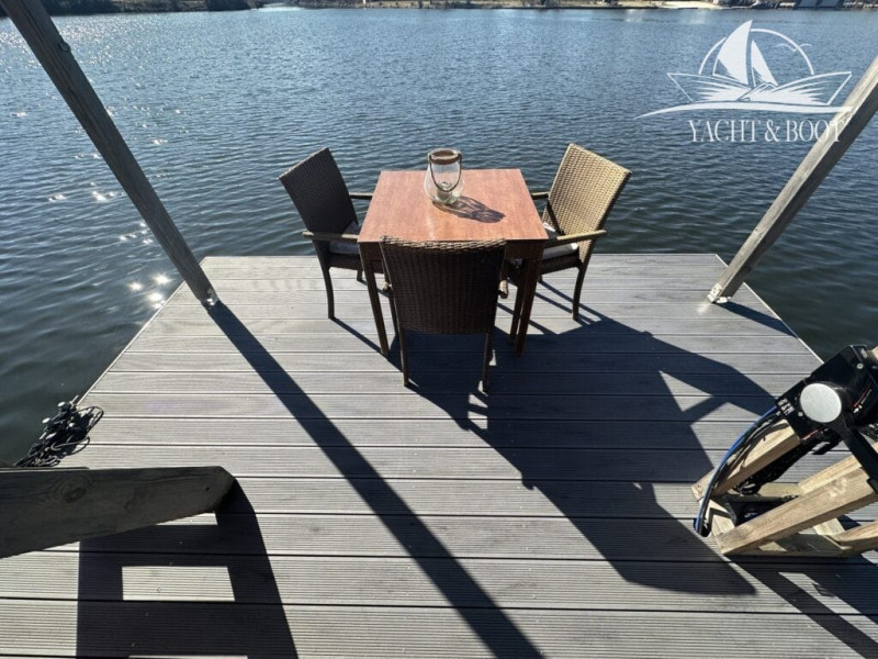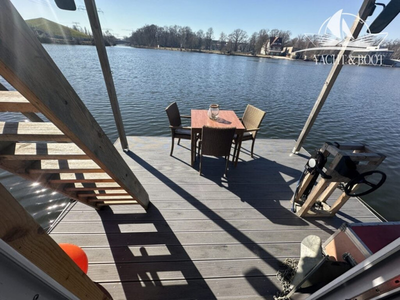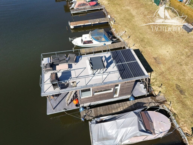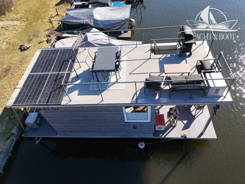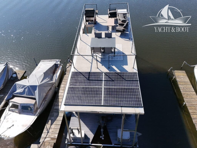 Das Technus Hausboot ist mit einer großflächigen DachTerasse gebaut worden,welche über eine Leiter von der unteren Terrasse erreichbar ist. Dazu gehört eine Sitzlounge mit Tisch mit Stühlen. Für die autarke Stromversorgung sorgen 4 große Solarplatten