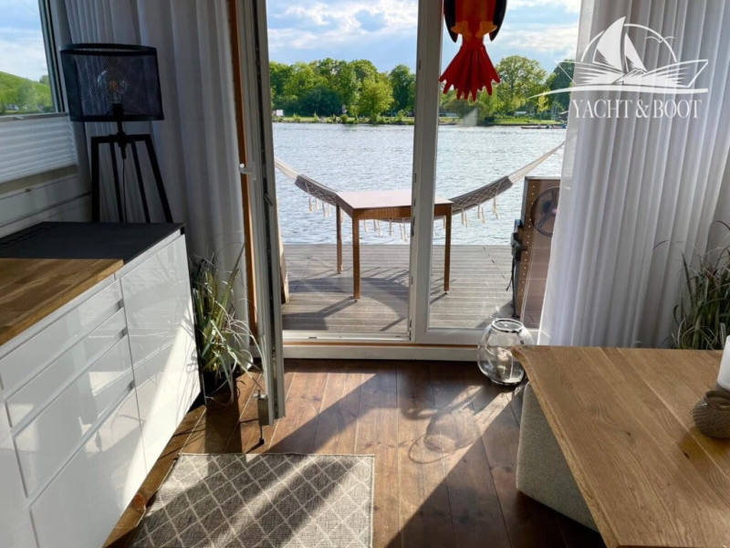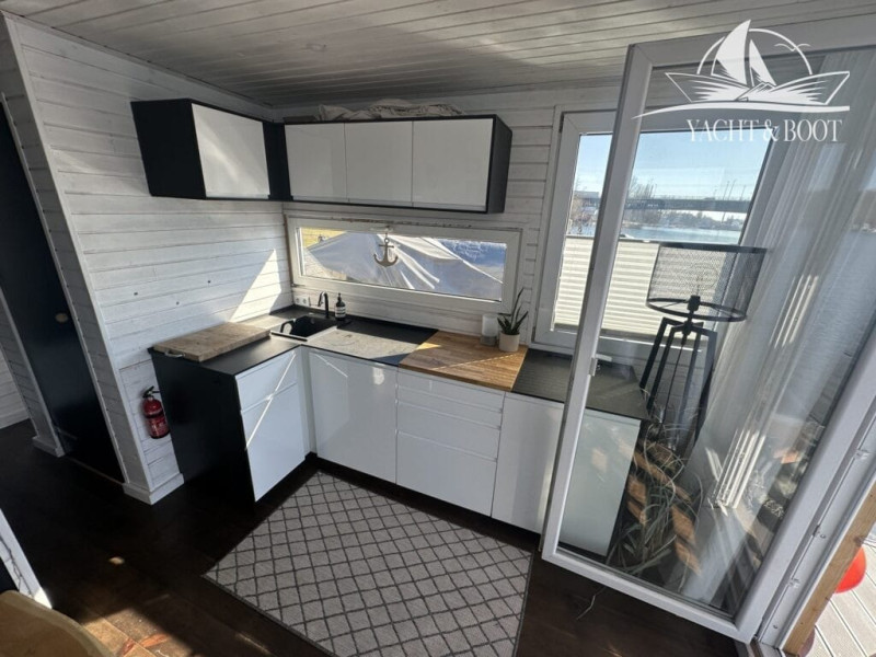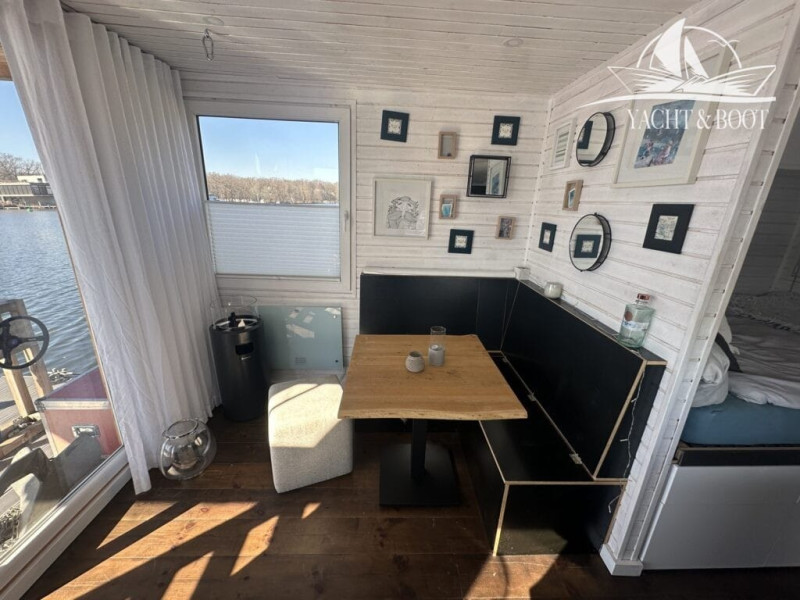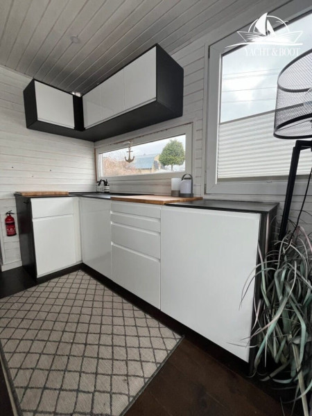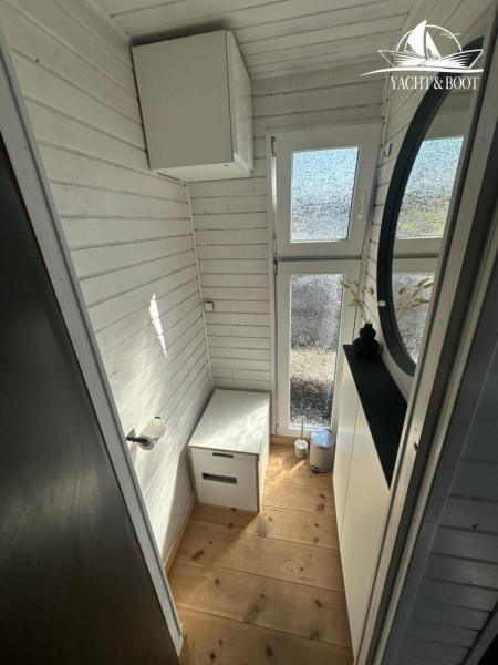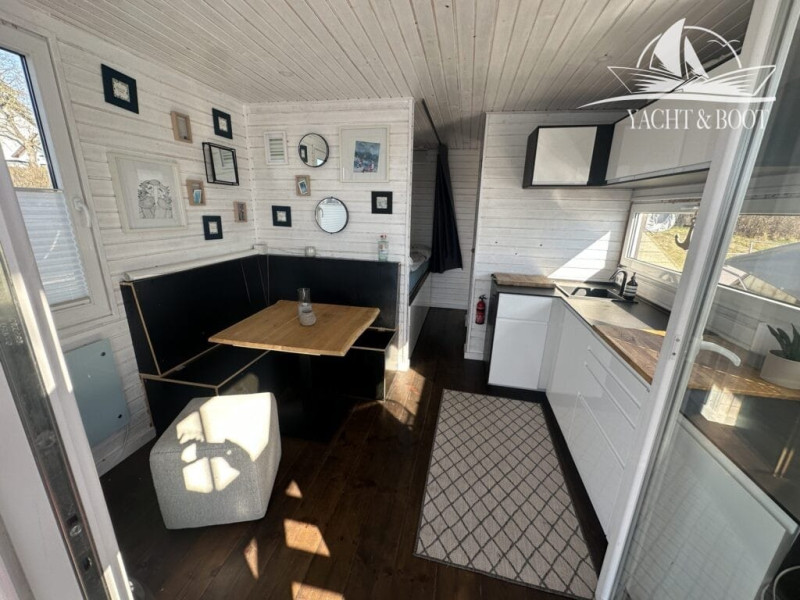 Im Hausboot befindet sich eine Küche, ein Essbereich mit integriertem Stauraum und ein kleines Bad mit Chemietoilette, sowie ein kleiner Flur und ein Schlafbereich mit darunter liegendem Stauraum. Hier ist die Stromanlage von Victron verbaut.
