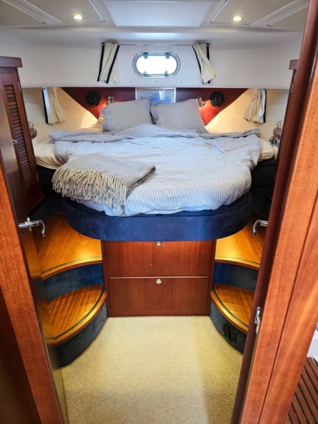 Large luxurious Master cabin with large double bed with mattress, indirect LED decorative lighting under the bed, wardrobes, storage cabinets & large storage areas on each side, 220v socket, openable skylight sunroof with blackout curtain & 3x side windows (1x openable) with blackout curtains