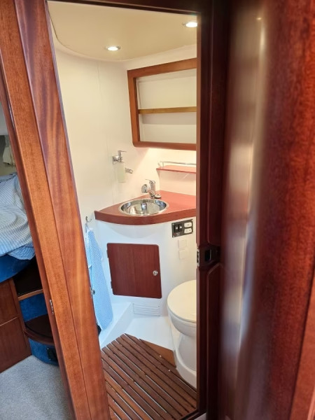 Private bathroom to Master cabin with hot & cold water, separate shower cubicle (high standing height) with bench, electric flush toilet, mirror cabinet, storage cabinet, stowage & opening side window