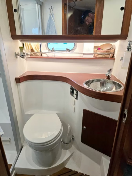 Guest toilet (starboard) with sliding door, hot & cold water, electric flush toilet, shower, mirror cabinet, storage cabinet, storage, 220v socket & opening side window