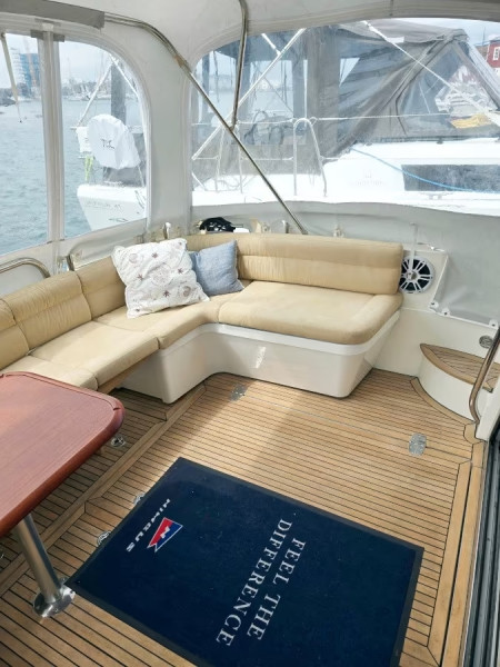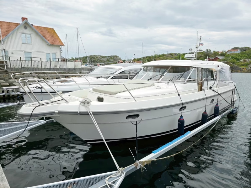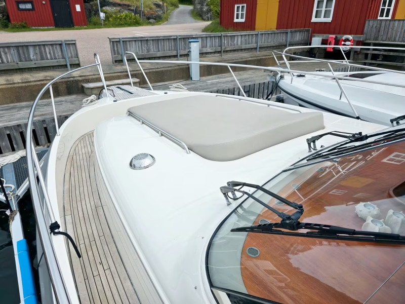 This very impressive Nimbus 42 Nova with bowsprit with fold-down bow ladder and open pulpit with grab rail in the bow, is very well equipped and upgraded for a big total amount of money with new aft canopy, new sun cushion with raised headrest on the front deck, new upholstery in Niroxx in the salon and wheelhouse, 2x111W solar panels (keeps the consumer battery bank in the boat loaded when you are out at sea), powerful bow- and stern thrusters, electric windlasses with stainless anchors both in the bow and in the stern, defroster/underfloor heating with plenty of exhausts under the windshield in the wheelhouse and also by the aft cabin windows, 5kW diesel heating system with exhausts in all interiour rooms with toilets included, new Shipcontroller remote steering system with increased speed & digital engine data functions that controls the engines, the bow- & stern thrusters, both electrical windlasses, the autopilot and the horn, new GPS-plotter/multiscreen Raymarine Axiom 12" with sonar/fishfinder, new radar Raymarine Quantum 18" Wired & WiFi, new autopilot Raymarine, new AIS transmitter/receiver, new soundsystem Fusion 770 bluetooth with Fusion 8,8" speakers in cockpit and Bose speakers plus SUB in the salon and underwater lightning e.t.c.