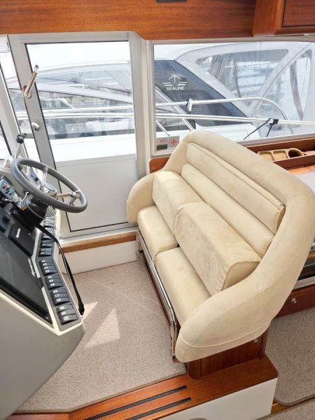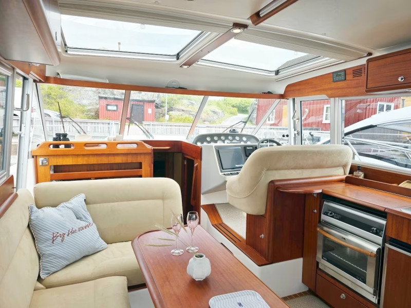 In the boat's wheelhouse, 4 people can sit comfortably and socialize during the journey, this as the front part of the saloon's dining group can easily be flipped forward so that a forward-facing 2-seat passenger sofa is created. From the driver's seat, you as the skipper have a fantastic view when you maneuver the boat and thanks to the double captain's doors out to the boat's side decks, which also have openings in the grab rails just outside the doors, it is quick and easy for you as the skipper to launch from the pier and dock the boat when you arrive in port. Since the boat has powerful bow- and stern propellers that you can easily control with a remote control, you can always maneuver the boat safely in port, regardless of the weather and wind.