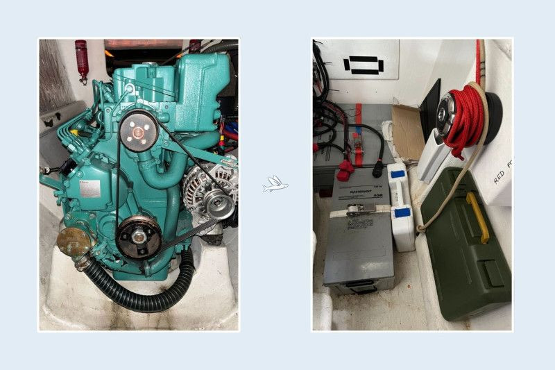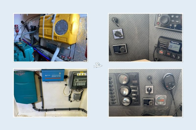 220V socket, Anchor, Battery, Battery charger, Electric bilge pump, Mechanical bilge pump, Electric Bow windlass, Folding prop, Inverter, Shore power 230V, Solar battery charger