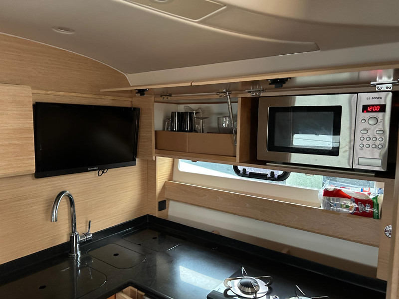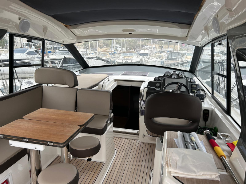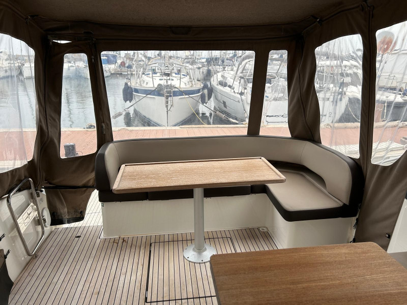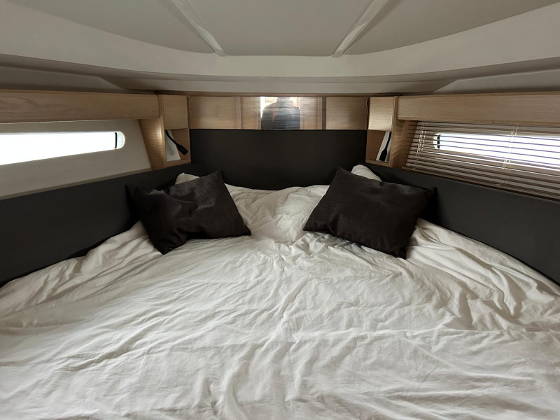 Smart Power Package, Comfort Package, Bow thruster, Teak on bathing platform, Cockpit grill, Fabric sunroof electric with inner lining, Camper roof, Electric anchor winch with Delta-anchor and chain, Cushion set inside and outside, Microwave, Gas cooker with 2 burners, Fusion Marina Basis Package, TV cabling (without TV) only preparation for 12V in the salon, VHF station, Garmin Blackbox, VHF 300 AIS, chart plotter, Garmin GPS Map 7410, high-quality foldable cockpit table that can be lowered, camper roof, underwater paint,