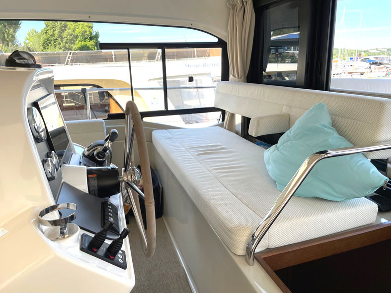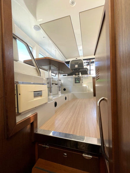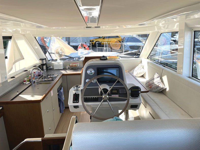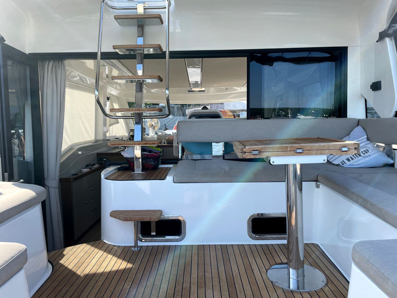 2de stuurstand op de flybridge, Voorkajuit, Eigenaarshut, Binnenvaarstand, Salon, Teakhout op het zwemplateau, Teakhouten loopbrug, Teakhouten loopplank, Teakhouten treden op de loopbrug, Teakhout op het voorschip