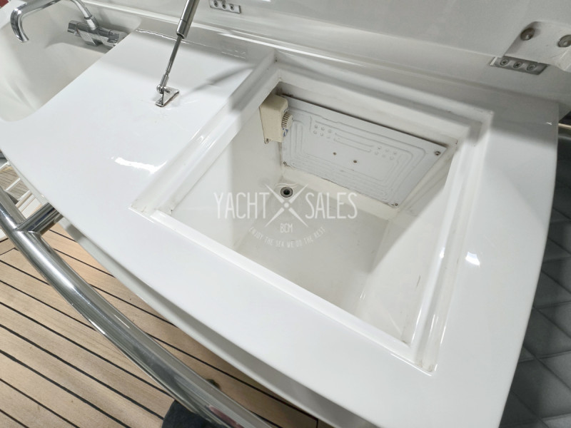 Large flybridge with U-sofa with table for 7 people, deck lighting, wet bar with sink with hot & cold water & fridge/freezer (24V), 3-seater captain's sofa & sun deck with sun cushions for 3 people next to the driver's seat