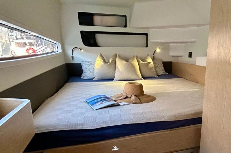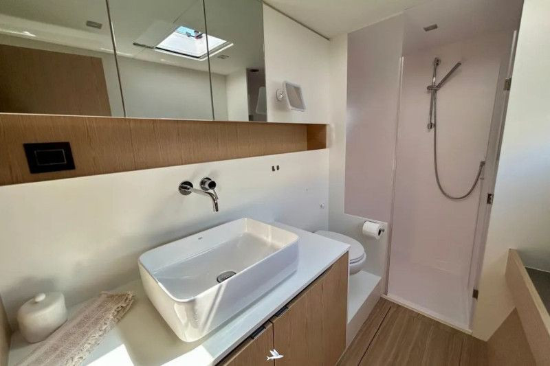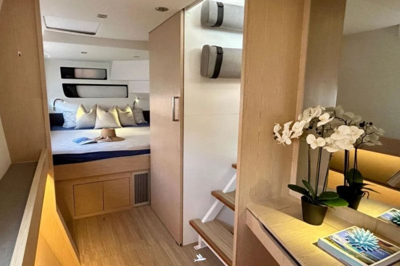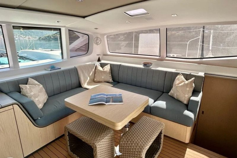 Exceptional Bluewater Catamaran with Outstanding Performance. Designed by VPLP, the OUTREMER 55, first presented at BOOT 2020, closes the gap between the 51 and 5X models and offers several innovations, such as the folding steering wheels, a central kitchen island in the saloon, a well-thought-out ventilation concept and revised energy management. This October 2022 launched N°14 exemplifies Outremer's renowned craftsmanship, combining impressive performance with exceptional comfort. After two sailing-seasons in the Mediterranean, the owners return to business and offer the opportunity to take over this exceptional catamaran. N°14 features a spacious saloon and cockpit with cork flooring that stays cool in any temperature. Elegant carbon accents and warm finishes ideal for both ocean crossings and relaxed coastal cruising. A powerful air conditioning system ensures year-round comfort. Equipped with ample storage, electric winches, and dual helms. Her performance features include a carbon mast & boom, Jefa reinforced steering system, and a incidence sail wardrobe with two asymmetric spinnakers + gennaker. Equipped for long-distance cruising with two Volvo Penta D2-60 engines, foldable propellers, lithium battery bank, and 2,200W solar power. Ready for immediate cruising, berthed in Montenegro, available for viewings.