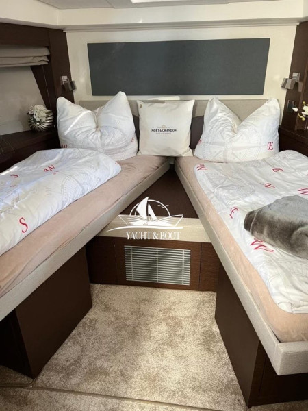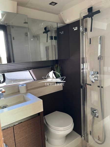 Drabinka, Platforma kapielowa, Stól na kokpicie, Zurawiki lodziowe, Prysznic pokladowy cieply/zimny, Urzadzenie wody pod cisnieniem, Telewizja, Radio, Obicia przeciwsloneczne na pokladzie dziobowym, Podwójna przyczepa, Klapki wywazajace elektryczne/hydrauliczne, Antena TV, Urzadzenie cieplej wody, Pralka, Pralka/suszarka, Speaker