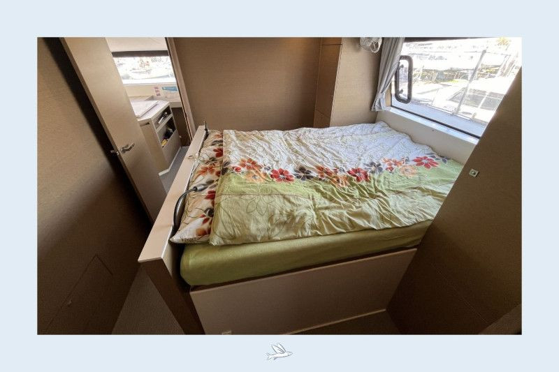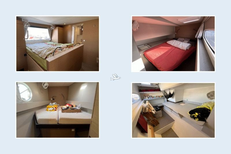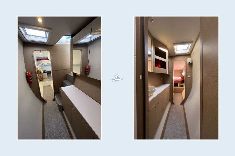 Curtains for the entrance sliding door / Curtains + mosquito blinds in cabins / Additional shelves in the engine room, forward bathroom and technical room / Strb. outer hull with storage shelf and worktable to be used as a workshop / Storage area instead of a bedroom / Illuminated globe / Second deck shower hot/cold / WiFi