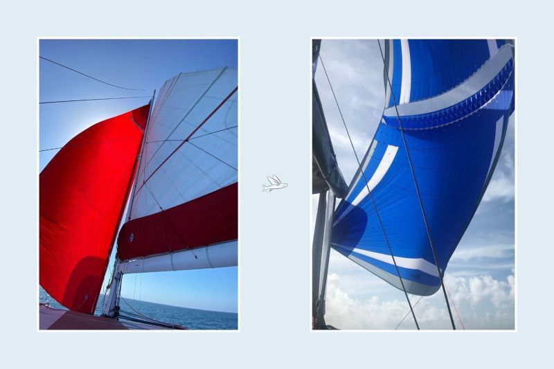 3 Parasailor (252 m² yellow, 232 m² red, 283 m² blue) 3 Spinnaker (A2, 205 m² 1 new, 1 repaired, A4 for strong wind)