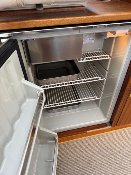 Refrigerator drawer from Waeco and the longitudinal sofa in the saloon