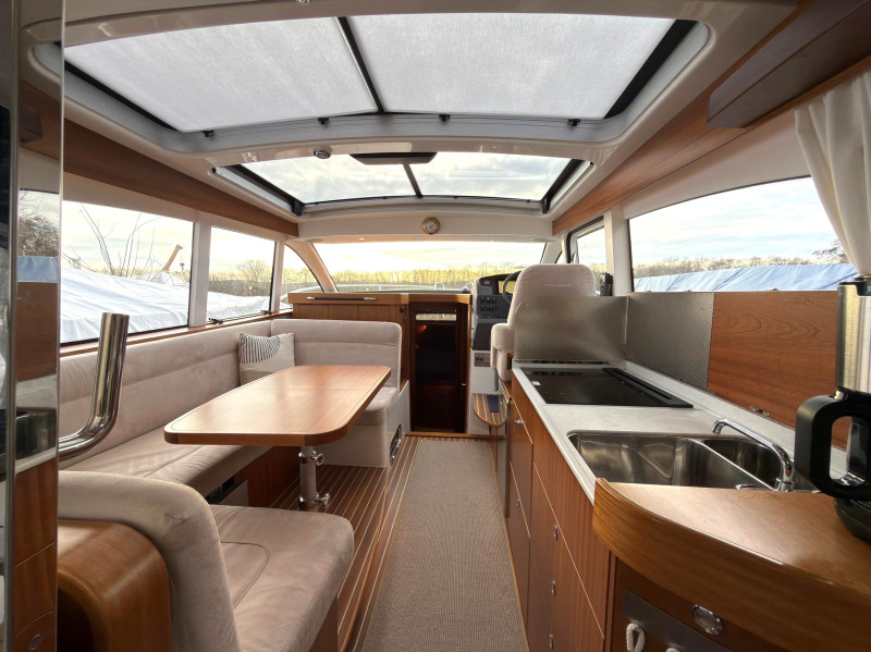galley with 2-burner gas ceramic hob 12/220 V refrigerator, Refrigerator drawer from Waeco and the longitudinal sofa in the saloon